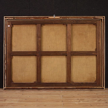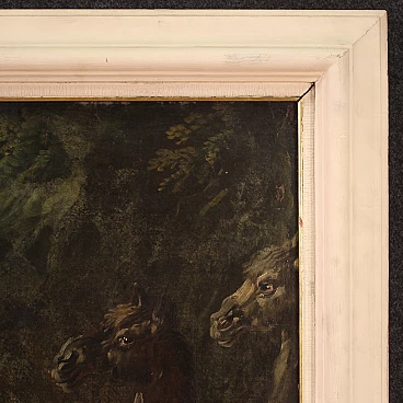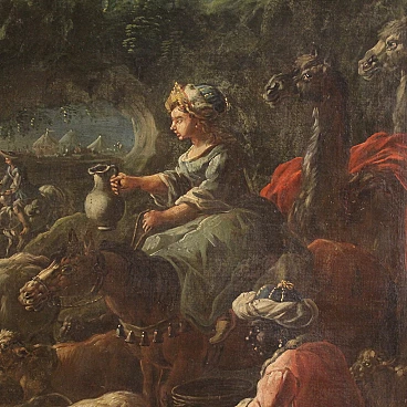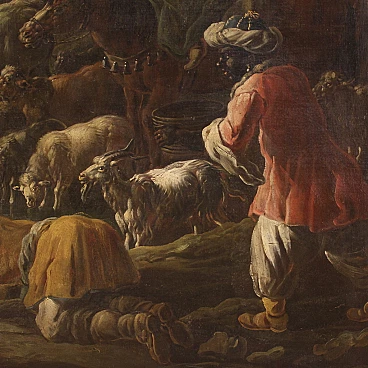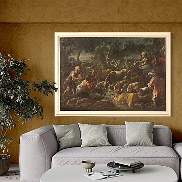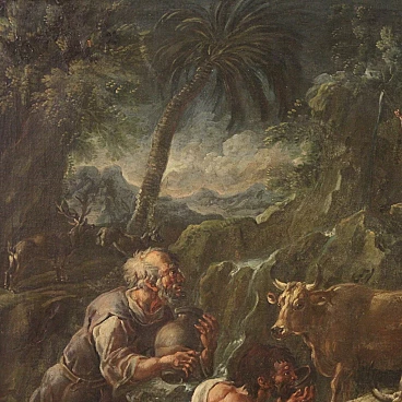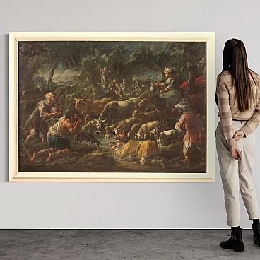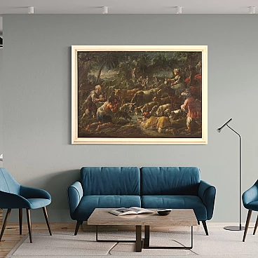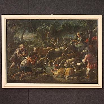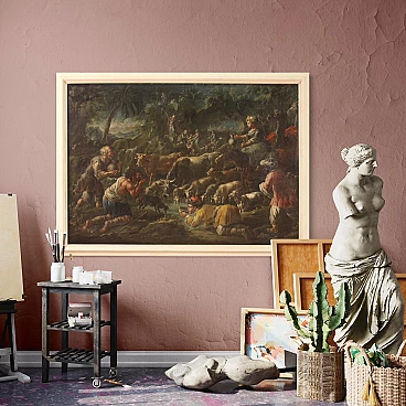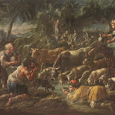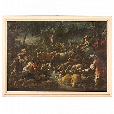 Italian school of the first half of the 18th century. An oil on canvas work of considerable size and excellent painterly hand depicting a splendid landscape with a biblical scene in the background, Moses brings forth water from the rock. Painting attributable to the painter Jacob Roos known as Rosa da Napoli (1682-1730), lacking authentication. He was one of the best animal painters active in Italy at the beginning of the 18th century. The first-born son of Philip Peter Roos, he worked in the family workshop and his painting was also influenced by the work of Domenico Brandi. In an Arcadian atmosphere, a myriad of characters and animals are about to drink from the river created through the miracle of Moses. We find a woman on horseback with two camels in tow, some peasants and a black servant with a vessel in his hands. The animals are numerous and masterfully painted, from the camels already mentioned to the deer at top left, then cows, sheep, goats and a very sweet shepherd dog. Beautifully decorated lacquered wooden frame, with some signs of time. Painting that has undergone conservative restoration with re-staining, replacement of the frame and repainting in places, overall in good state of preservation. Light painting H 123 x W 176 cm.