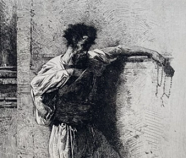 Etching "Brutalisation/Memory of Constantinople" by Alberto Pasini (Busseto, 1826 – Cavoretto, 1899), 1870. A full-length, shaggy man absorbed in prayer is represented, leaning against a sunny wall, projecting a mysterious shadow behind him . Vigorous translation of a model taken from life in Istanbul (Botteri Cardoso 514) on the occasion of the trip to the East in 1855 following the French Minister Bourée. In its definitive state, with the title and indication of the printer Lovera, it was published in Arte in Italia in November 1870. Copy forward letter. Excellent impression with delicate background glazing on light laid paper, wide margins. Perfect state of preservation. Sheet applied to the upper corners on contemporary ivory cardboard. Bibliography: Giubbini n 1; L'acquaforte italiana dell'800, Rassegna storica, 1955, pag 47, n 2; Botteri Cardoso, Pasini, 1991; Godi – Mingardi, Alberto Pasini da Parma a Costantinopoli via Parigi, 1996.