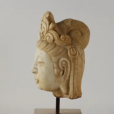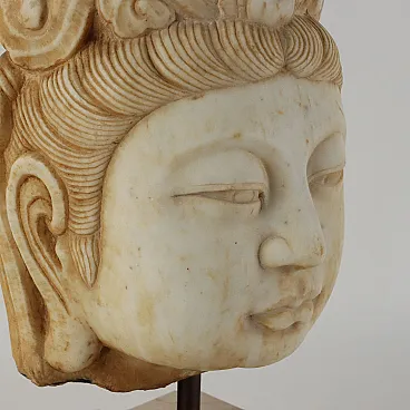 Guanyin's head sculpture in marble with travertine base. Chinese production, 20th century.
