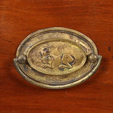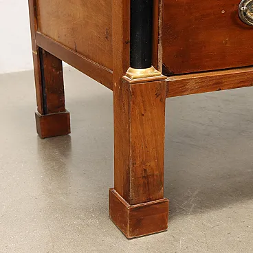 Empire dresser supported by plinth feet. On the front has pair of drawers framed between ebonized half-columns (gilt base and capital rebuilt later in plaster) to support the under-top band, in which is another drawer. In walnut, the interior in fir wood. Italian production, 19th century.