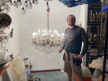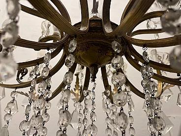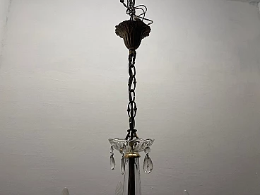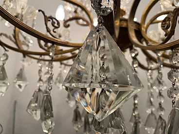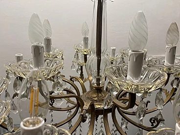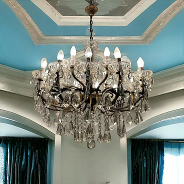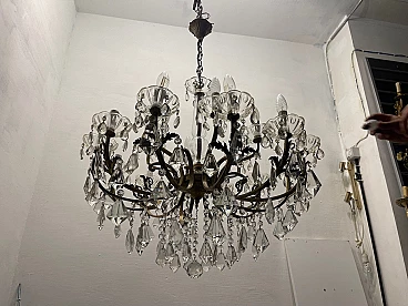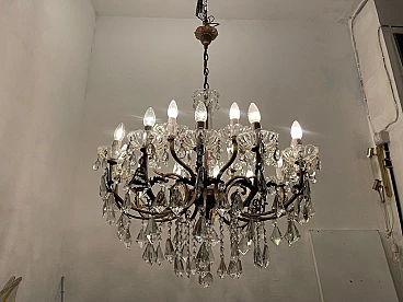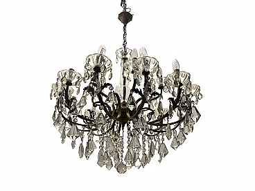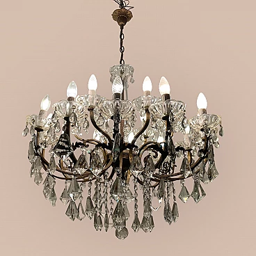 Large 18-light Murano glass and bronze chandelier, 1960s. Price - € 1 550.00 per item. Design period 1960s, country of manufacture Italy. 1960s crystal and bronze chandelier with 18 lights. Central piece in Murano glass. Bronze frame with pendant lead crystals. Height including chain and ceiling canopy 107 cm, height without chain 80 cm, width 80 cm. New wiring compatible with UK, Europe and USA. Delivery in wooden box. Bronze, crystal and Murano glass. Weight between 40 kg and 80 kg. Very good condition, this vintage/antique item is faultless, but may show slight traces of use. Slight wear consistent with age and use, electrical components rewired and/or new. Is this piece in working condition? Yes, I had the piece rewired by a professional electrician.