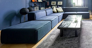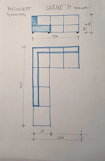 BOCONCEPT CARMO modular sofa in the XL version in top of the range, upholstery in soft dark blue fabric in top of the range fabrics, design Anders Nørgaard. Very large 350x270cm sofa with corner composition. Purchased in 2021, for 8500 euros. Very good condition. Minimal signs of domestic use. There are only 2 mini specks, barely visible. For the rest it's OK. L-shaped modular sofa, but can also be positioned differently. For sale this beautiful designer sofa, for change in a smaller attic. ---------------------------------- BOCONCEPT was founded back in 1952 by two Danish craftsmen and cabinetmakers, Jens Ærthøj and Tage Mølholm. The company represents one of the most important Scandinavian furniture companies and is based in Herning, in the central region of Central Denmark on the Jutland peninsula. BoConcept is a Danish furniture retail chain of excellent quality with 340 stores in 65 countries around the world. It produces furniture designed by multifaceted and innovative international designers. Overall dimensions: Width 350 cm Depth 270 cm Height 70 cm. Seat height 39-42 cm.