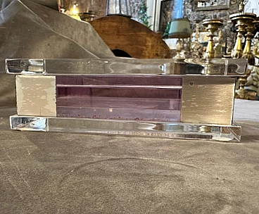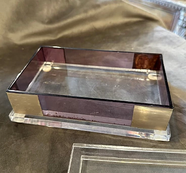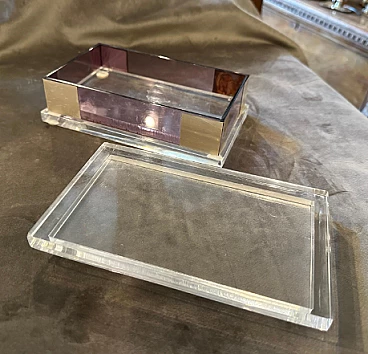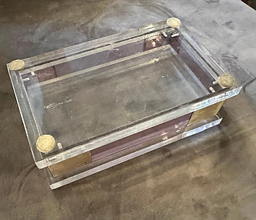 Rectangular box in transparent and pink lucite with silver details, 1980s. This jewelry box encapsulates the exuberance and style of its era, offering a compelling synthesis of form, function and aesthetic appeal. It serves as both a practical storage solution and a striking decorative piece, reflecting the dynamic design ethos of the 1980s. Crafted with meticulous attention to detail, this box combines an elegant blend of materials and geometric shapes to create a striking and functional piece. Its structure in lucite, a resistant and transparent acrylic material, offers a contemporary and minimalist aesthetic. The use of lucite in clear and pink shades adds a playful and trendy touch to the design, reflecting the vibrant color palettes popular in the 1980s. Complementing the lucite elements, silver details adorn the box, infusing it with a touch of luxury and sophistication. The silver details feature clean lines and geometric patterns, echoing the modernist design principles prevalent during the era. Being an Italian creation, the box may also incorporate elements of Italian craftsmanship and design style, known for their attention to detail and commitment to quality.