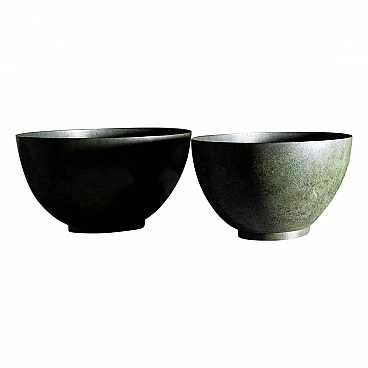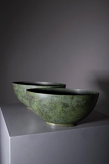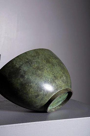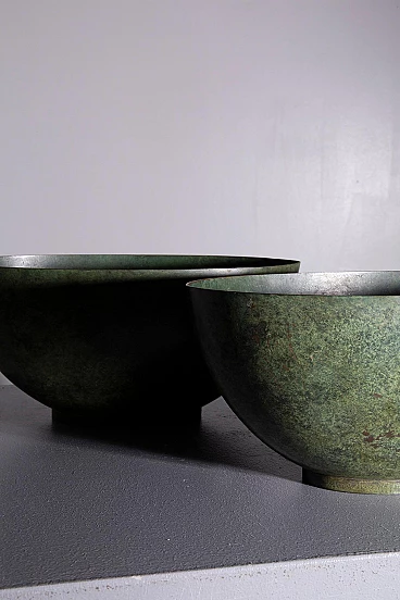 Pair of bronze bowls/vases, early 20th century. At the heart of the art and innovation that marked the dawn of the 20th century, these bronze vases/bowls emerge as jewels of time. Born in a period of extraordinary cultural effervescence, when Italy, a crossroads of artistic currents and cradle of master craftsmen, was beginning to explore new horizons of design, these vases are much more than simple containers, they are the custodians of a history, of a knowledge that passes time to reach us. The choice of bronze, with its eternal strength and intrinsic nobility, gives these artefacts an almost mystical presence. Each vase/bowl, embraced by this precious alloy, takes on a semi-oval shape that seems to dance under the light, capturing the very essence of fluidity and movement. The surface of each piece, enriched with a patina that subtly plays with shades of antique green and gold, becomes a landscape where time seems to have left its mark, telling stories of bygone eras. The elegance and refinement emanating from these vases/bowls adorn any space with timeless grace, making them perfect for those seeking to immerse their home or office in an atmosphere of history and culture. They are not mere objects but bridges to an era of magnificent beauty, capable of inspiring and stimulating contemplation and dialogue with art. To welcome this pair of bronze vases into your home is to embrace a part of that vibrant Italian artistic history of the early 20th century, a period when art challenged the boundaries of the known to explore new forms and meanings. Each vase is an invitation to travel through time, to discover and rediscover a beauty that, despite the passing of the years, remains unchanged, evidence of an era of undisputed aesthetic value.