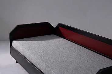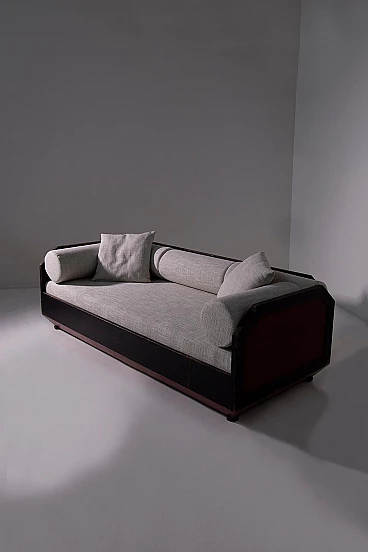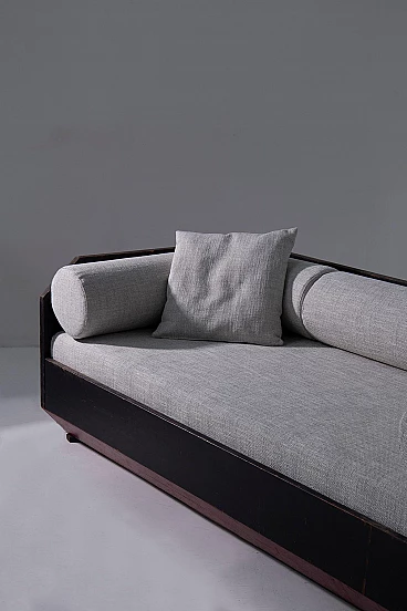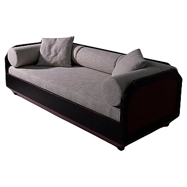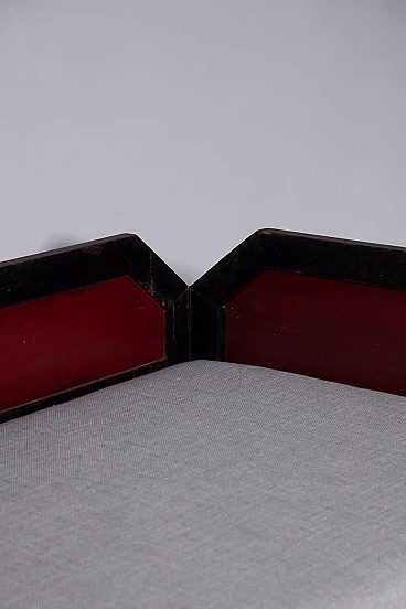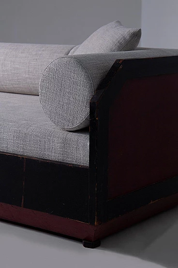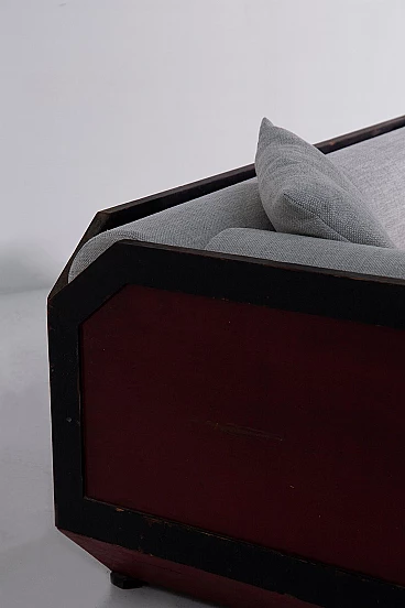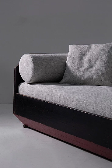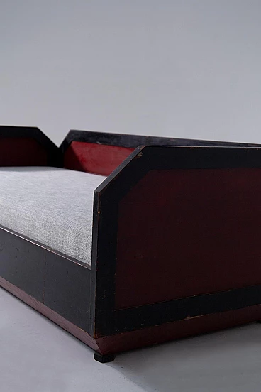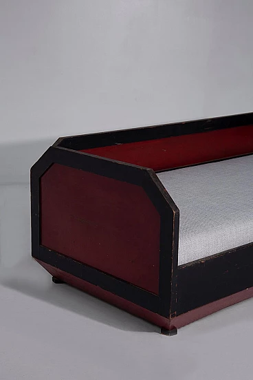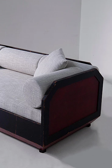 Futurist sofa in wood and fabric, 1910s. Enter a portal of artistic innovation and historical reverence with this extraordinary futurist sofa from the dynamic 1910-1915 period. It is not just a piece of furniture but the embodiment of a revolutionary movement. Its original patina has been preserved, whispering stories of a bygone era, while the recent upholstery breathes new life into its timeless form. The wooden structure, altered by the hands of time, bears the scars of its journey through history, but therein lies its unparalleled beauty; every imperfection, every mark, tells a story of resilience and resistance, a testament to the passage of time and the enduring appeal of craftsmanship. And if restoration is desired, the potential to revive its former glory remains ever present, ready to honour its legacy for generations to come. The wooden frame has two coverings, on the inside we see a warm, bright red, while the backs are painted black to emphasise the importance of the geometric shapes. But it is the seat that captures the imagination, adorned with a vibrant grey Italian cotton that dances in harmony with the natural grain of the wood. This juxtaposition of textures and tones reinforces the inherent beauty of the material, elevating it to new levels of aesthetic splendour. The sofa itself exudes an air of futuristic elegance, its rigid yet graceful lines and geometric shapes testifying to the avant-garde ethos of the movement. Completing the sofa are two square cushions and two cylindrical cushions that encircle the entire perimeter of the very elegant and refined interior. Ideal for rooms or living rooms with a penchant for the classic and a thirst for untold stories, this sofa promises to be more than just a seat, it is a living artefact, ready to weave itself into the fabric of your home and your heart. Seat height: 41 cm.