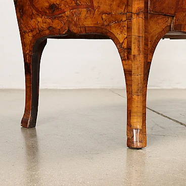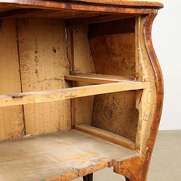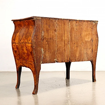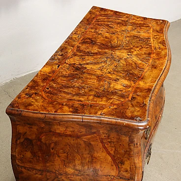Lombard baroque chest of drawers supported by elegant wavy legs. It has bowed and wavy sides and front and two drawers. Veneered in walnut burl and ornamented with bois de rose fillets with poplar interior. Italian production, 18th century.