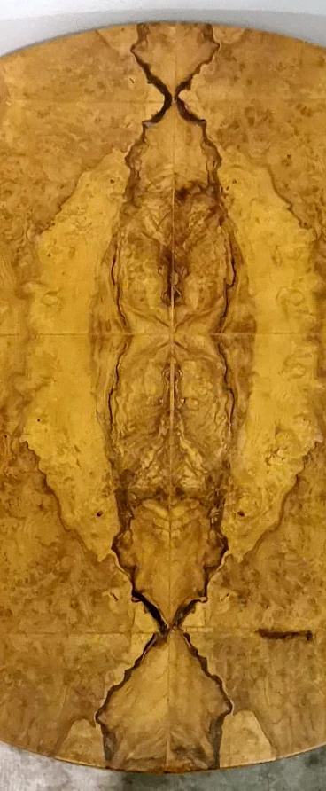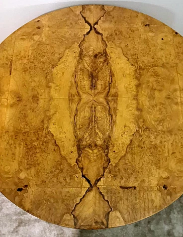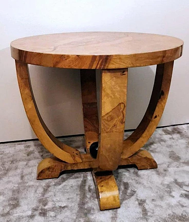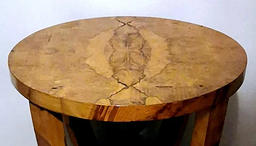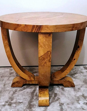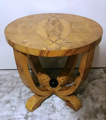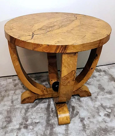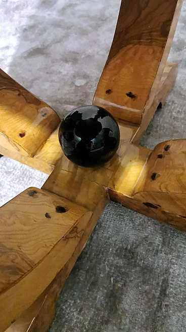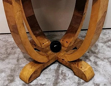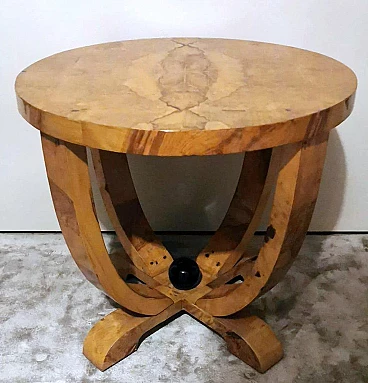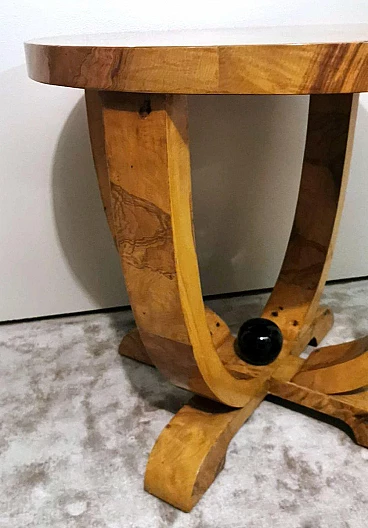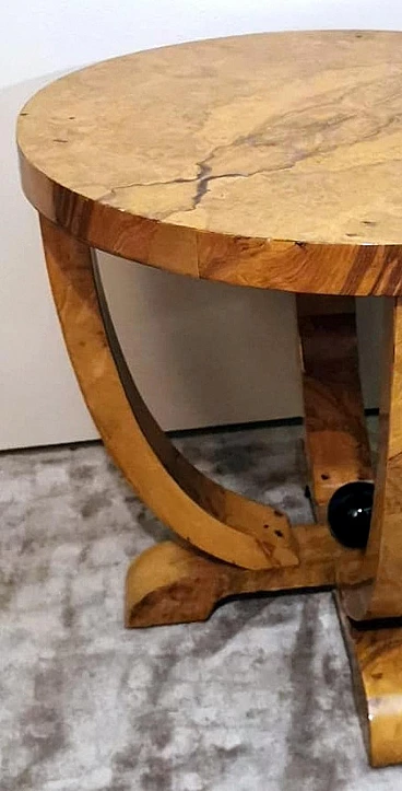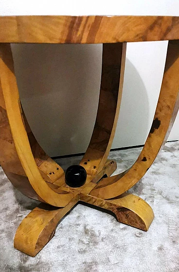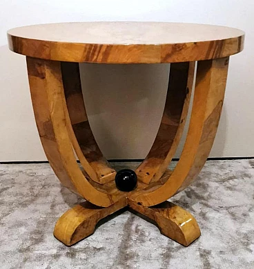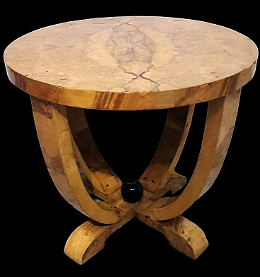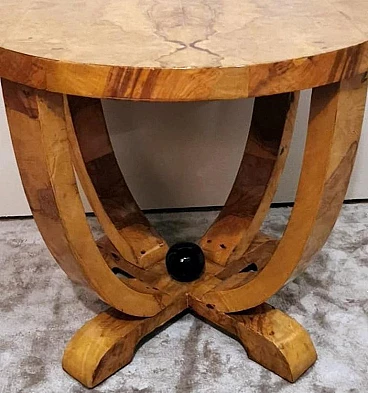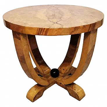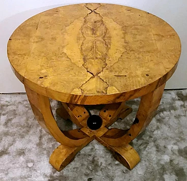 A refined and elegant Austrian Art Deco coffee table in blond walnut. It has a very clean and linear form, aesthetically refined and pleasing. The round top is supported by curved legs that join at the bottom on a solid cross-shaped base, giving the whole an excellent stability; a black wooden ball has been placed at the junction of the legs, emphasising the Art Deco style even more. The coffee table was made between 1930 and 1935 in a craft workshop in Riegersburg, a small Austrian municipality in the Südoststeiermark district of Styria, which is famous for its furniture production, a limited but high quality production. The distinctive and unique element of the coffee table is the wood with which it has been veneered: blond walnut. Walnut wood (Juglans regia) is a valuable and expensive wood, and the 'blond walnut' variety is even more so; it is characterised by a light colour with shades tending towards yellow, warm tones and very pronounced grain, qualities that are highly valued in the luxury furniture sector. Blond walnut is a hardwood; its nuances, flames and grains have been appreciated for centuries. Blond walnut furniture is highly sought after but also expensive because the proportion of usable wood in each plant is very small. Veneering is an ancient woodworking technique involving the application of a thinner layer of fine wood on a substrate of normal quality walnut wood. Precious walnut wood is harvested from trees specially cultivated for this purpose, which is then cut into thin sheets varying in thickness from 1 to 2 millimetres. The base wood is prepared by applying a special glue, then the high-quality walnut sheets are applied manually and evenly. After this process, everything is pressed and left to dry, allowing the glue to adhere firmly between the high-quality walnut wood and the substrate, creating a stable veneer. Once dry, this is finished by sanding, polishing and application of protective finishes, such as varnishes or oils, to improve the appearance and durability of the wood. The history of cladding goes back many centuries, it is believed to have first been used in ancient Egypt and China. Over the centuries, this technique has spread throughout the world and continued to evolve, becoming an important part of the production of high-quality furniture, luxury goods and objets d'art. This ancient technique, applied to this coffee table, has made it possible to enhance the colours, flaming and grain of the precious walnut. The craftsmen who worked on this coffee table have succeeded in creating an extraordinary, refined and fascinating piece of furniture, extraordinary and unique, capable of communicating suggestions of times gone by, of tradition and functionality. It has been hand-restored by our team of craftsmen and is in perfect condition.