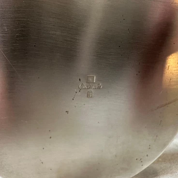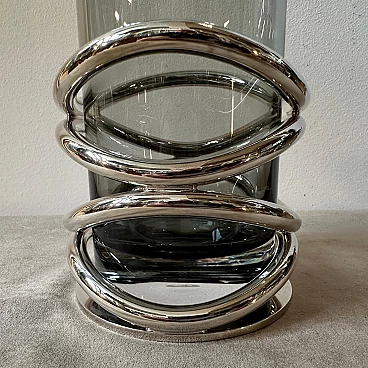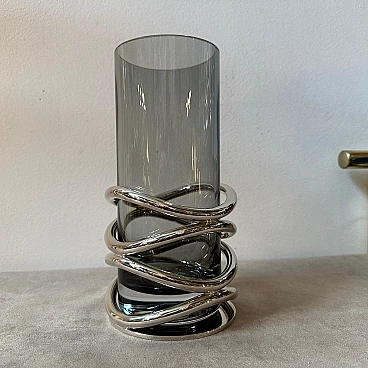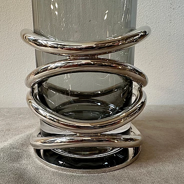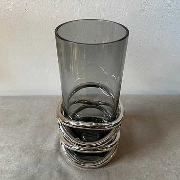 Vertigo vase by Andrée Putman for Christofle, 1990s. It embodies the spirit of his era, combining modernist aesthetics with luxurious materials to create a timeless and captivating work of art. Made by Christofle, a renowned French manufacturer known for its exquisite silverware and decorative objects, this vase exemplifies the brand's commitment to quality craftsmanship and timeless elegance. The vase features a striking combination of silver-plated elements and smoked glass, creating a visually appealing contrast between the bright metallic finish and the translucent, smoked shade of the glass. The silver portion of the vase features clean curves that reflect the modernist design principles prevalent in the 1990s. The silver plating not only adds a touch of sophistication but also serves to enhance the overall aesthetic appeal of the vase. Smoked glass, with its soft, sophisticated coloring, lends an air of mystery and depth to the vase, while at the same time allowing light to play across its surface in subtle and enchanting ways. The vase design is minimalist with a focus on clean silhouettes and understated elegance. It is in perfect condition and complete with original box, it has never been used.