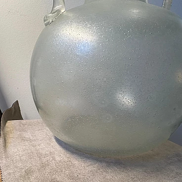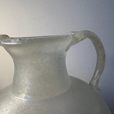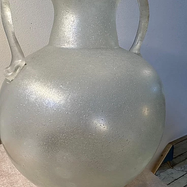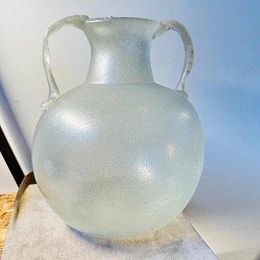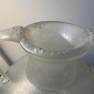 Murano "scavo" glass amphora vase attributed to Cenedese, 1960s. It is a valuable and sought-after piece among Murano glass collectors. Cenedese is a well-known and respected Murano glassmaker, famous for his high-quality glass creations. The term "scavo" refers to a technique used in glassmaking to create an antique or aged appearance, often by etching or treating the surface to simulate age or wear. Amphora vases have a characteristic shape reminiscent of ancient Greek or Roman vases, with a narrow neck and a wider body. The combination of the "scavo" glass technique and the amphora shape makes this vase truly unique and of great visual impact.