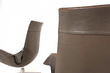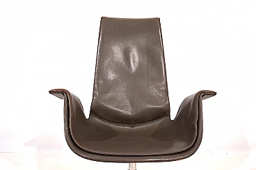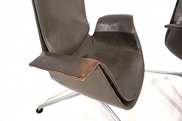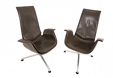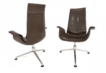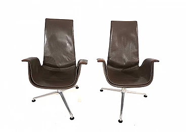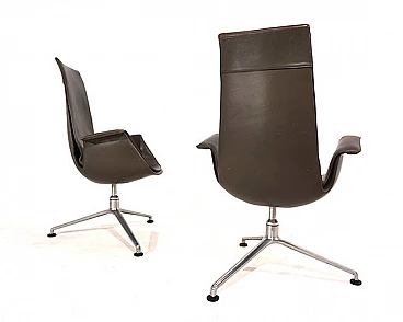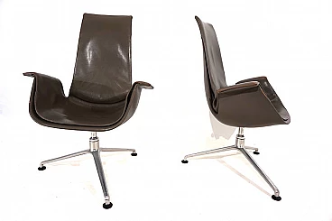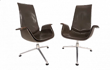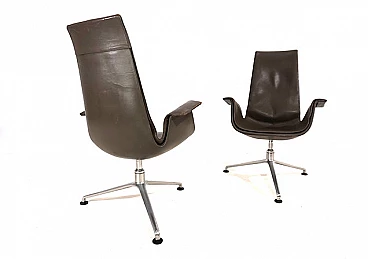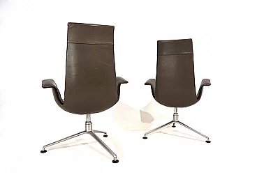 Pair of FK 6725 Bird armchairs by Kastholm & Fabricius for Kill International, 1960s. This pair of elegant high-back armchairs is in very good condition. The dove-grey leather shows almost no signs of wear and has a charming patina on the armrests. Typical three-legged structures show signs of wear consistent with age. The armchairs swivel and rotate smoothly. These armchairs can be used as office chairs or dining room chairs. This Kill version is the older original one designed by Kastholm & Fabricius for Alfred Kill International. These armchairs continued to be produced by Knoll in a later version. The designer duo Jorgen Kastholm & Preben Fabricius designed these armchairs in the style of functional and aesthetic Scandinavian design in the 1960s and created an absolute design icon. Seat depth: 41 cm. Height at the armrests: 67 cm.