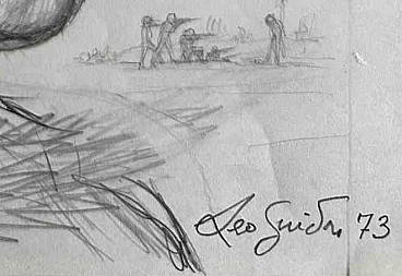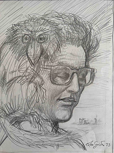 Pencil drawing on paper by Leo Guida depicting a man with an animal on his shoulder, 1973. Hand-signed and dated lower right. Good condition. Leo Guida was able to weave a productive activity on art and the function of art with many generations of young people throughout his career. He was a teacher at the Liceo Artistico in Latina from 1969 to 1985 and trained many of the artists that characterise the Italian cultural scene today. His production of graphic works was copious, in which he showed all his talent for the techniques of intaglio, etching, aquatint, burin, etc. In his pedagogical work, he led students to observe both plastic forms and internal evolutionary dynamics and not only the history of art.