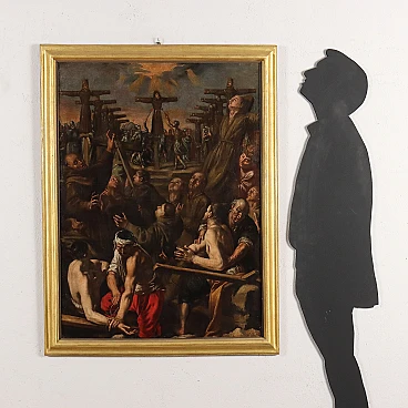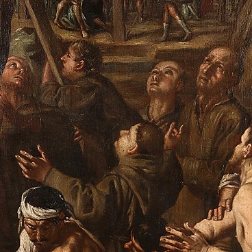 Oil painting on canvas. The work is a faithful copy of the homonymous masterpiece by Tanzio da Varallo (1580-82 /1633), created by the painter from Valsesia for the Franciscan convent of Santa Maria delle Grazie in Varallo, and currently preserved at the Pinacoteca di Brera. The painting depicts the martyrdom which occurred in 1597 in Nagasaki of twenty-three Franciscan friars, who were subsequently beatified in 1627, a date which allows us to place the work in the last years of the artist's activity. Tanzio da Varallo was probably inspired for its creation by the text "Life and exploits of the Martyrs of Japan" by the Spanish Franciscan Marcello di Ribadeneira; of the Brera painting we know a partial preparatory drawing (preserved in the Pinacoteca di Varallo), a sanguine drawing published by Testori (1964) and a canvas (from a private collection in Borgosesia) published by Ferro. The replica proposed here is faithful to the original, even in size, only a few centimeters lower in height, probably lost during the re-lining of the work. Although it is a copy of notable quality, where in particular the richness of highlights stands out which stand out on the warmer and darker tones of the flesh tones, compared to the original one notices a lower fineness of execution, a tendency towards simplification and a pathetic accentuation, which they testify to the hand of a copyist concerned with reproducing the model in every detail, without granting himself any license. Furthermore, this copyist seems to have been very familiar with Tanzio's style, to the point of even perfectly imitating his hooked hands. One can therefore think of a pupil of Tanzio or of his workshop (which was continued by his brother Melchiorre upon Tanzio's death), or of an artist who saw and appreciated his works, such as for example Pietro Francesco Gianoli, who worked above all in churches in Valsesia and in the Novara area and of which other replicas of works by Tanzio da Varallo are known, such as David with the head of Goliath. Furthermore, since the work presented here, before being acquired by a private collector, remained located for centuries in a Franciscan convent in Lombardy, it is plausible that it is a copy of that of Tanzio commissioned by the Order itself, for another monastery, by a painter who was stylistically close to Tanzio and could look to the original.
