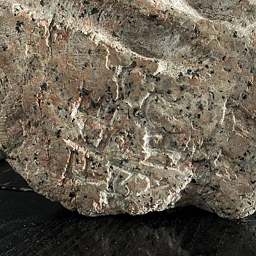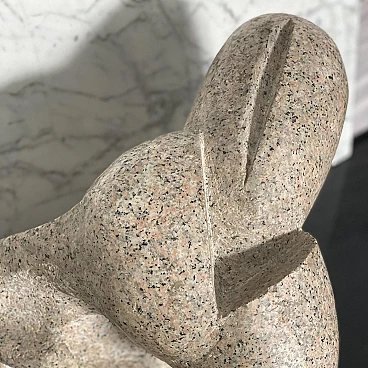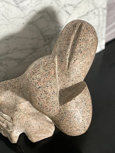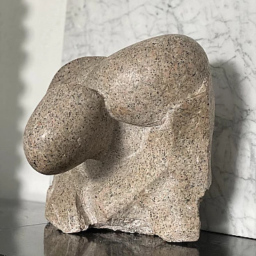 Very rare and fine sculpture by Italian artist Aldo Flecchia, created in the 1970s from a block of solid pink granite. This is a very plastic abstract composition with smooth, angular forms. It is extremely textural, and the play of light on its surface helps to create very defined images. According to some it is a representation of the embrace between a mother and her child; others think it represents two lovers joined in an embrace. You might see anatomical shapes or even something completely different, and that is the beauty of this work: its inherent possibility, which leaves your imagination free. The sculpture has a special mark left by the artist, who carved a handprint near the base. Flecchia's signature is engraved in a circle and encloses a number that is most likely a "73", referring to the year the work was created, when the artist was 28 years old. The sculpture is massive and well preserved. There are no cracks in the stone, and the surface is still shiny and smooth with a light, even patina from the years.