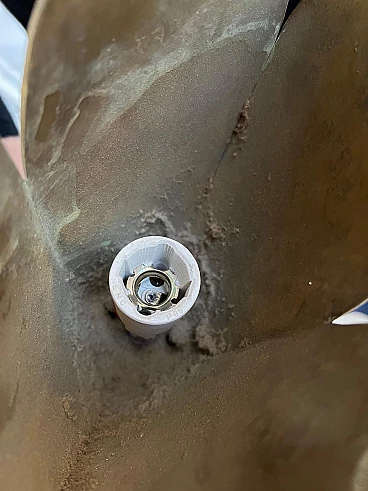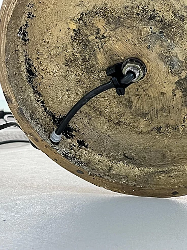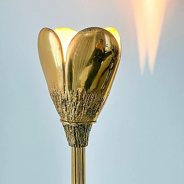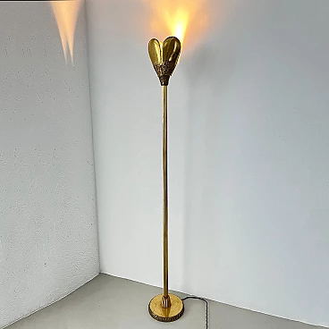 Sculptural solid brass floor lamp, 1950s. Finely hand-decorated base and shade and extruded structure. The stem has a peculiar "gear" section, while the other parts - the base and the heart-shaped shade - are smooth with an interesting "bark" decoration, clearly hand-made, reminiscent of the works of the famous sculptor Arnaldo Pomodoro, just like the beds he designed with Osvaldo Borsani. The lamp is very well preserved, still shiny but with a rich, uniform and very pleasant patina that confirms its origin. It is fully functioning, as the attached pictures show. It was rewired at some point in its life and currently operates by means of a sliding switch with dimmer, which, however, can easily be converted to a normal one.