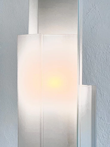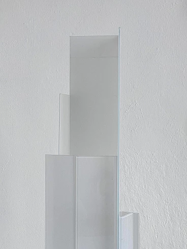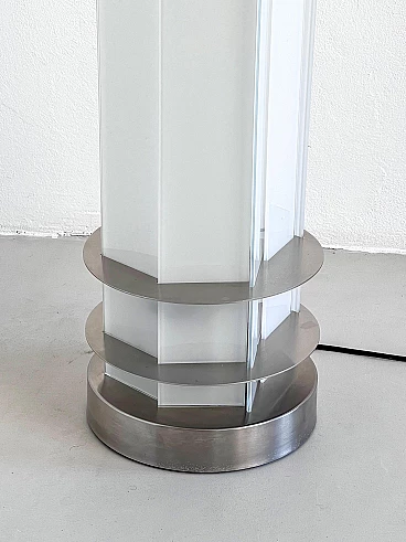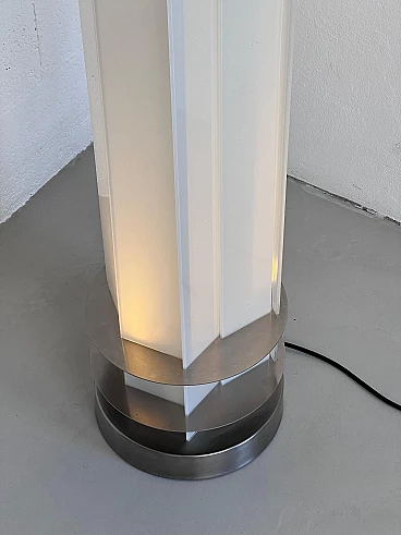 Sculptural floor lamp by Matteo Nunziati for Fontana Arte. This lamp, designed in the 2000s, is inspired by the straight, vertical lines of the Burj Khalifa in Dubai - currently the tallest building on the planet - and is aptly named "Adubai". It stands on a heavy cylindrical stainless steel base and has a total of seven opal glass "blades" towering above it. The light comes from two sources: two LEDs at the base and one at the top, creating a beautiful diffuse illumination. The light is dimmable.