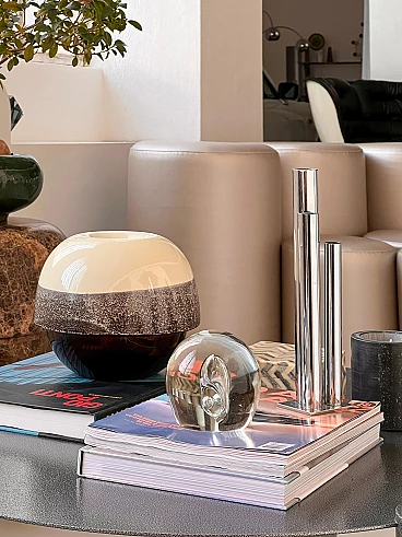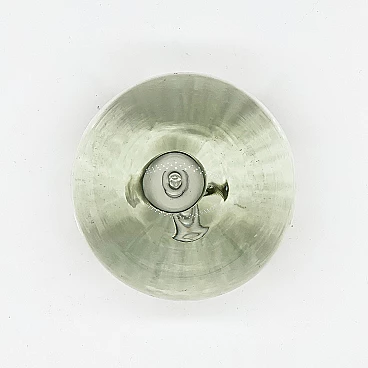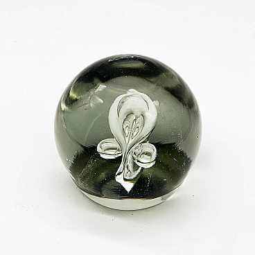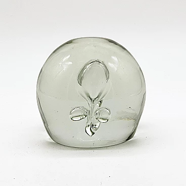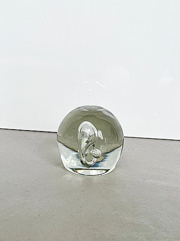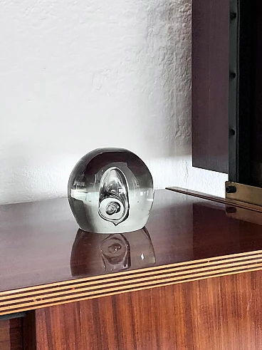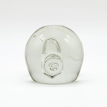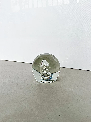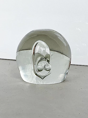 Sculptural paperweight in transparent Murano glass with bubbles inside, 1960s. Carefully crafted through a complex technique, which involves injecting air into the glass while it is still hot. It is extremely well preserved and very charming. The surface is smooth and shows no signs of time, other than small and predictable dents; it has no chips, neither on the surface nor along the profile of the base. It is still shiny and the color of the glass is a beautiful shade of transparent aquamarine. Its attractive simplicity and mesmerizing details make it ideal for placing in a contemporary setting, whether as a paperweight or as a simple decorative piece.