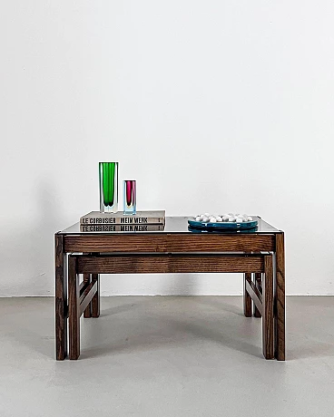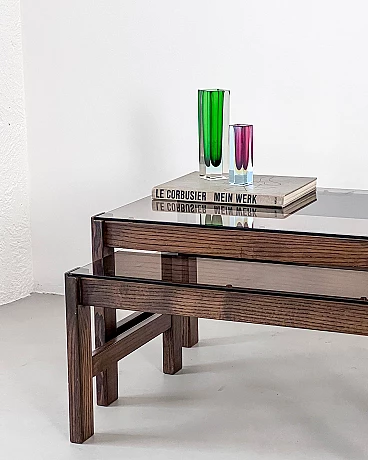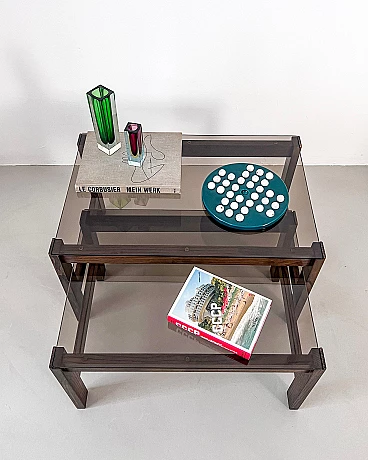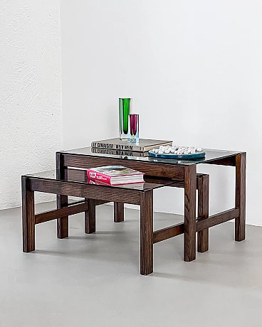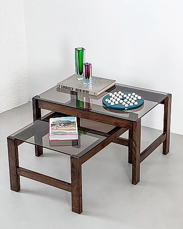 Pair of nesting tables, 1960s. Solid wood structure (probably walnut) and slightly smoked glass top. The essential but refined design is reminiscent of pieces created in the 1960s by Gianfranco Frattini and other designers and produced by, among others, the famous Cassina furniture factory in northern Italy. Their origin is almost certainly Italian, and the details make them very elegant. The design is absolutely timeless: the glass top perfectly complements the wooden frame, the rounded corners of the legs and the overall composition. When stacked, the two side tables almost look like a single element. They are preserved in excellent condition with slight signs of use and an even, pleasing patina. They are perfectly stable.