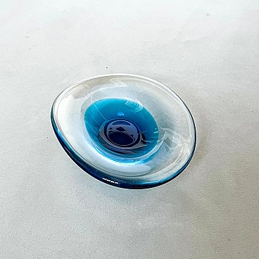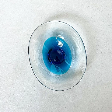 Transparent and blue submerged Murano glass bowl, 1960s. The "submerged" glass technique was invented by the designer Flavio Poli and the glassmaker Archimede Seguso in the 1950s; consists of creating objects by layering different colors of glass, to obtain a finished product in which the colored glass appears to be actually immersed in a transparent main body. The bowl proposed here, of medium size, is very well preserved. It is perfect as a pocket emptier or as a decorative touch on coffee tables, sideboards, bookcases and more.