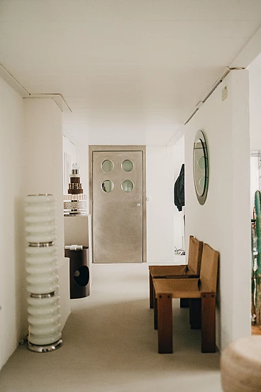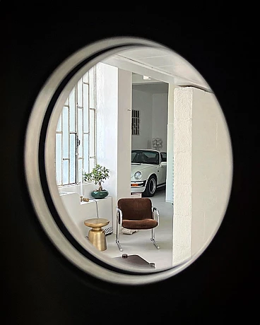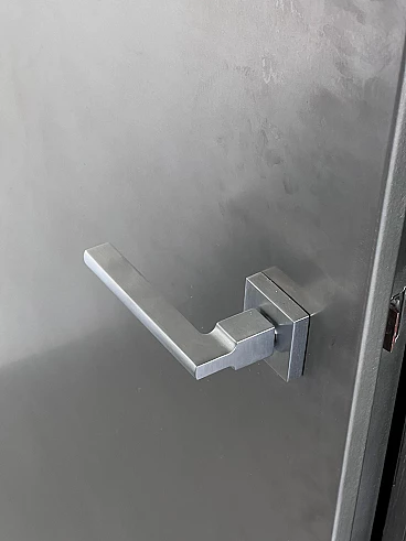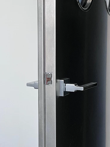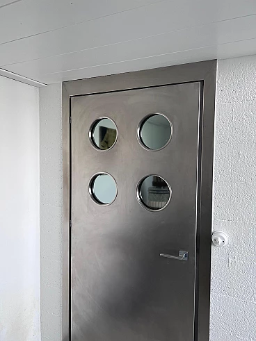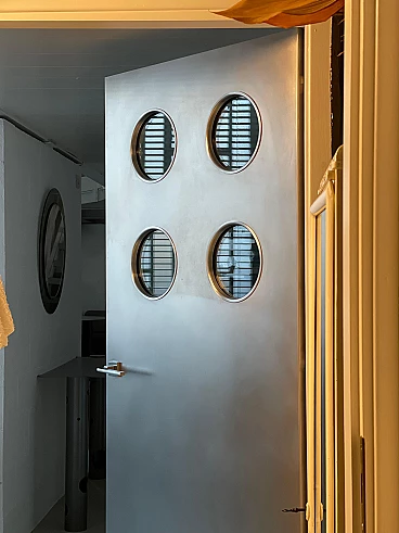 Contemporary steel door with portholes. Inspired by the works of Jean Prouvé, it is built around an existing regular wooden door, with the addition of round porthole openings with framed clear glass. The handle has been replaced to match the overall look, on both sides of course. The images refer to past works, made to measure on existing doors. The same work can be carried out on request on any other door, transforming it into a unique bespoke piece and a collector's design piece in its own right. The price refers to the average cost of the work from start to finish, but may vary depending on the model chosen, the material, the type of door, etc. Contact us for a personalized quote. It is also possible to create fixed decorative panels (without hinges or handles).
