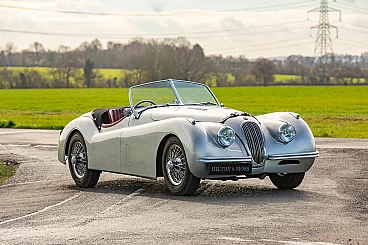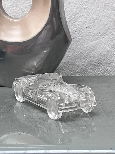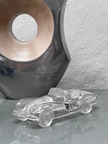 Transparent crystal Jaguar XK 120 model car, 1980s. Victorious on the track and extraordinarily elegant on the road, the Jaguar XK-120 is one of the most famous and versatile cars ever made by the legendary British manufacturer. Produced in a wide range of slightly different versions, with open or covered wheels, coupé or roadster, the model achieved iconic status and is now one of the most sought-after vehicles on the classic market. This piece of automotive history is offered here in a stunning scaled-down version, made of clear glass with a smooth interior and a matt "frosted" interior to bring out all the details. The body, engine and interior are all faithfully reproduced, making this small decorative piece an outstanding addition to any motoring enthusiast's desk, bookshelf or coffee table. The piece, probably dating back to the 1980s, is preserved in practically new condition with no marks or damage. The scale is approximately 1/32.