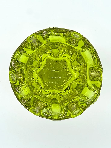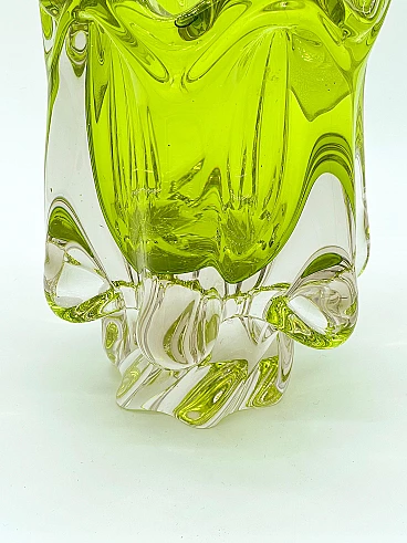 Lime green submerged Murano glass vase, 1960s. A splendid vase made in Murano using the "submerged" glass technique, in which the coloured glass (in this case in a vibrant yellow-green shade) is immersed in a transparent crystalline outer layer. The vase has a "rostrata" shape, typical of the famous glassmaker Archimede Seguso. The piece is extremely well preserved and, with its fluid shape and brilliant colour, is a sculpture in its own right. However, it can be used as a real vase, with flowers inside. There is no damage, no cracks, dents or chips; the only visible signs of time are some minor scratches and a general patina.