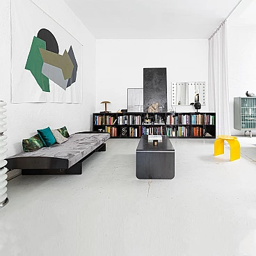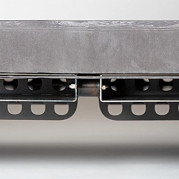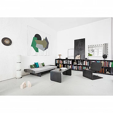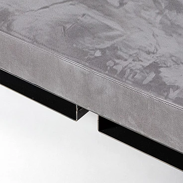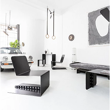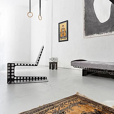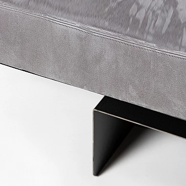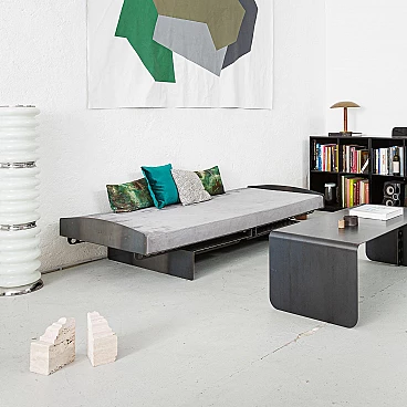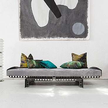 Metal and suede Meccano daybed. Sharp, masculine and playful are the pieces in the Meccano collection. The technical aspect of the construction world and the automotive lifestyle lend a unique attitude to the collection. Meccano is a daybed with rounded corners and a slim but robust structure that reflects the style of the collection. It is inspired by the world of mechanics and aviation, maintaining essentiality and giving a sense of minimalism to the space in which it is placed, either as a single piece mixed with other furniture or as a set. The cushion is made of premium grey suede, which is very soft and warm to the touch. The finish is called "burnt metal" and features the typical dark colour with blue veins or spots that metal takes on when it is forged in the oven, then coated with a transparent, semi-translucent finish to protect the finish. The imperfections in the colour of the material are the special feature of this collection: each piece is different in colour tone, size of the spots/veins and welding points. A small amount of roughness balanced with the precision of the laser-cut curves and lines gives the pieces the right character, masculine, timeless and suitable for Brutalist and Modernist architecture and interiors. The article is a former exhibition piece.
