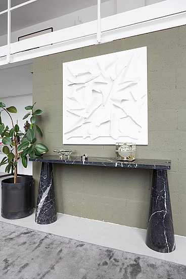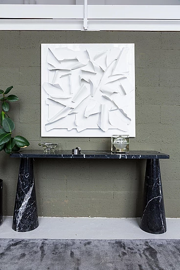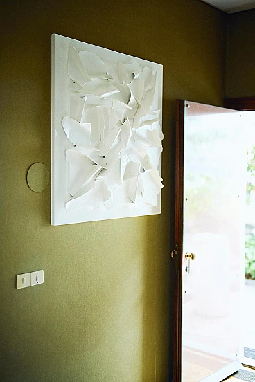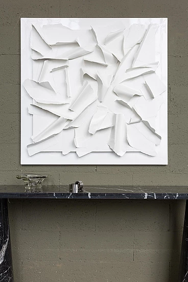 Large work "Esplosioni" made by Eugenio Galli in 2018. Galli is an abstract artist who has been researching the themes of light and substance for over thirty years. He began his artistic career as a figurative painter, under the guidance of Gianni Arde, and then moved on to non-figurative subjects when he felt the need to explore transcendence. At that point, he created a creative space highlighted by a soft and delicate use of color. The work proposed here is painted in solid white, the color he loves most, because it transmits light and substance in their purest form. It was created by applying layers of different materials onto a panel.