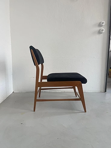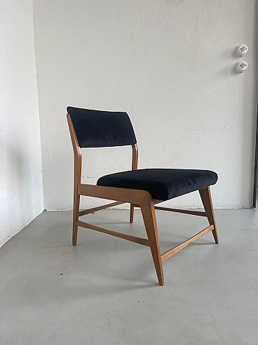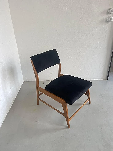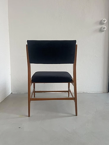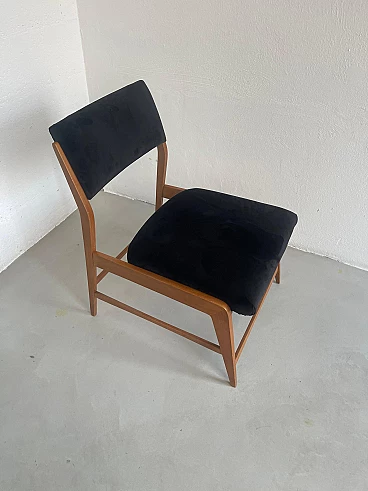 Pair of wood and black velvet armchairs in the style of Gio Ponti, 1960s. Timeless and extremely well preserved, they have a minimal and elegant wooden structure and padded seat and back; the latter have just been redone in smooth black velvet, obtaining a refined contrast with the light wood structure. They have compact dimensions and also fit into smaller rooms and apartments. Ideal for a living room around a coffee table but also in a bedroom to create an intimate sitting corner.