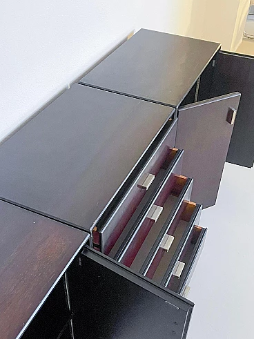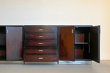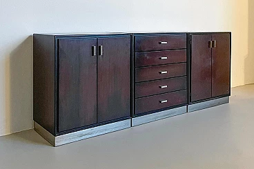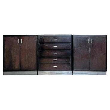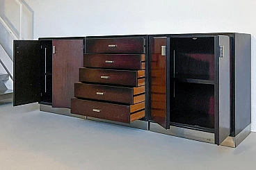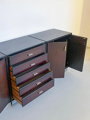 Sideboard by Gianni Moscatelli for Formanova, 1970s. Furniture made up of three modules in dark solid wood with stainless steel details. Moscatelli's stylistic signature, the piece is timeless and adapts to any furnishing style. Perfect for the living room, bedroom, entrance or walk-in closet. Its structure with drawers and doors makes it suitable for containing everything you need. The sideboard is preserved in original condition; it shows signs of time, the color of the wood is not perfectly uniform and light scratches are visible here and there.