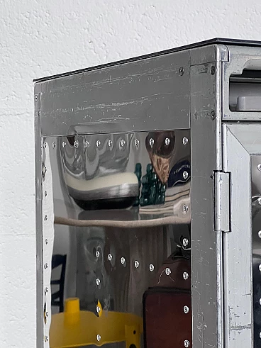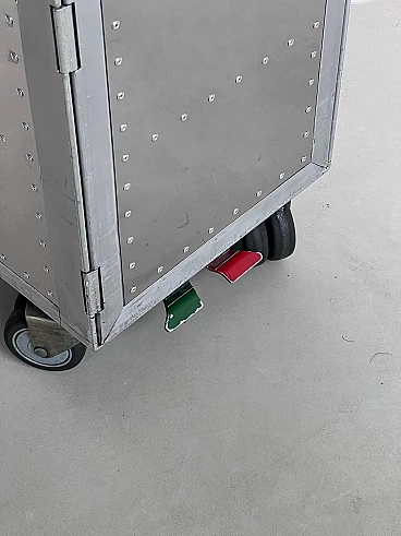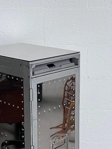 Airplane bar/service cart in steel, aluminum and plastic. A decorative industrial piece, this stunning airplane cart is the ultimate decorative touch for lovers of aviation and industrial aesthetics. Aged by time and use - which makes it even more authentic and charming - it has four wheels that roll smoothly, pedals for braking and unlocking and several internal drawers that can be easily rearranged to reconfigure the internal space. It's useful for storing various items and would make a really great bar cart, with plenty of space for spirits, glasses and various bar items. It is used and has signs of wear, including scratches and paint discoloration (where applied); for the rest, it is perfectly solid and complete in all its parts.