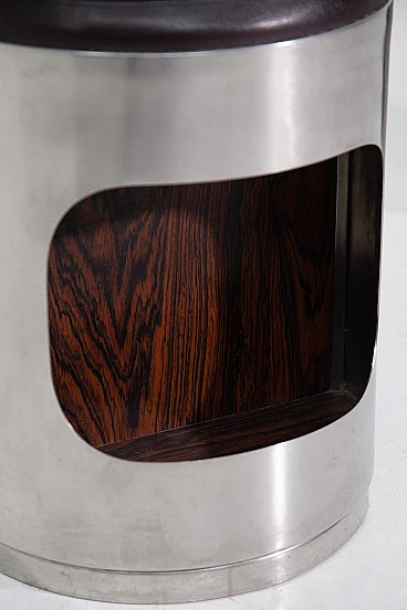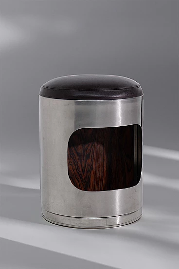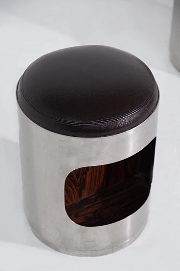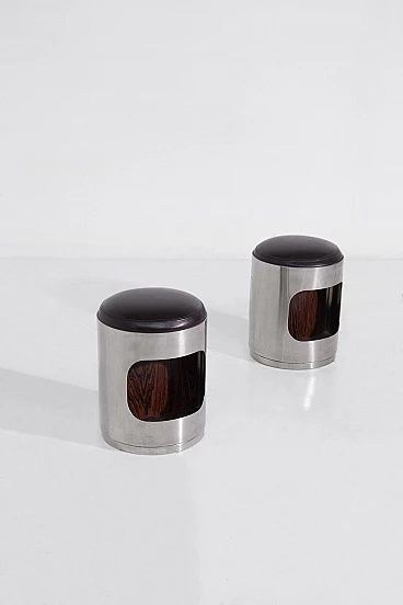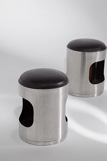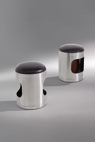Pair of stools attributed to Vittorio Introini, 1960s. This pair is a monument to that era's bold exploration of form and function, embodying the spirit of innovation that defined the space age. Crafted with an eye for geometric perfection, each stool boasts a cylindrical aluminium structure, a testament to the industrial elegance and futuristic aspirations of the period. What distinguishes these stools is not only their silhouette but also the masterful integration of functionality and design. Two openings are carved into the inside of the severe cylinder, an ingenious addition that transforms these pieces from simple seating to elegant storage. Nested within these cavities are wooden coves whose organic warmth contrasts with cold aluminium, creating a harmony of materials that whispers the sophistication of modern design principles. On top of these engineering marvels is a round cushion, covered with the original black leather of the time. This choice of material refers not only to the quality and authenticity of the stools but also to their comfort. It invites you to experience the luxury of times gone by, to feel the texture and durability of leather that has survived the decades, while remaining inviting and soft. These stools are not just furniture but artefacts of a time when the world looked to the sky and dreamt of the future. Their futuristic shapes make them the ideal centrepiece for modern, space-age environments, where they can act as a bridge between the dreams of the past and the reality of the present. Whether they adorn a minimalist living space or complement a sleek, contemporary office, they embody a timeless appeal that transcends their era.