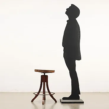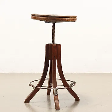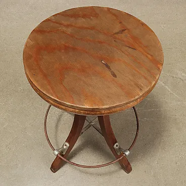 Beech stool from the Art Nouveau era, Italy, late 19th -early 20th century. The seat is anchored to the legs via a screw system that allows you to adjust its height. Wavy legs with metal footrest structure. Seat with plywood panel added later. It requires restoration.