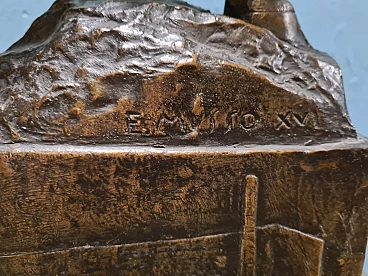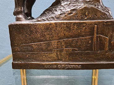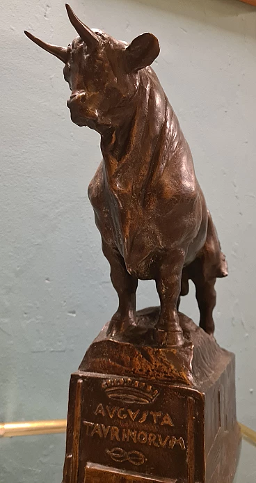 Turin monuments are depicted on the base and there is the writing Augusta Taurinorum. It also features the artist's engraved signature at the foot of the bull and can be dated to the first half of the 20th century. Emilio Musso was an important Turin sculptor who created several Piedmontese monuments, his works can also be viewed at the monumental cemetery of Oropa.