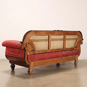 Restoration sofa in mahogany. Genoa second quarter of the 19th century. Carvings portraying leafy and phytomorphic elements, including the podded rosette placed on the top of the backrest and the voluminous anthemas of the armrests; breadsticked parts. A mahogany feather veneer acts as a backdrop to the anthems. Backrest, armrests and seat padded and covered with brocade fabric. Internal structure in poplar.