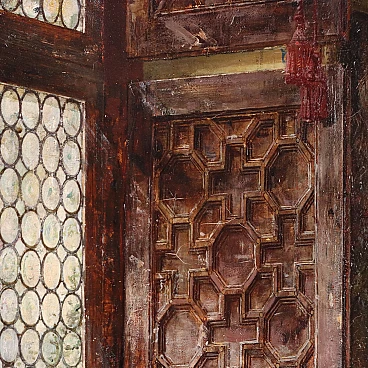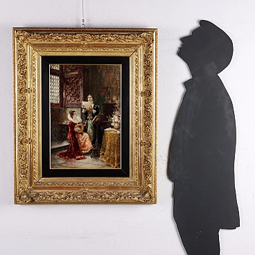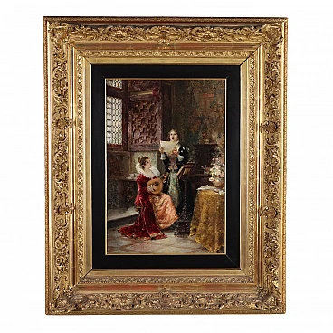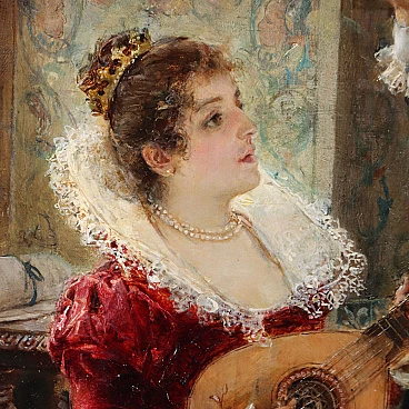 In this painting, of fine quality, March proposes an interior scene in a patrician setting, with two girls in eighteenth-century dresses who amuse themselves by playing the lute, one and the other singing; the two figures are placed near a high worked window of a rich hall, with frescoed walls and furnished with tapestries, with inlaid furniture and a fine damask fabric on the table. The capacity for pictorial rendering of details and details is notable. The painting is presented in a contemporary frame from the end of the 19th century.