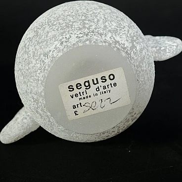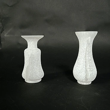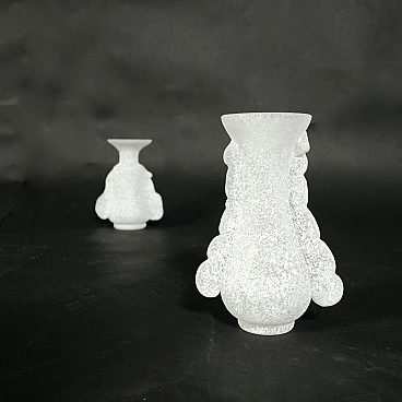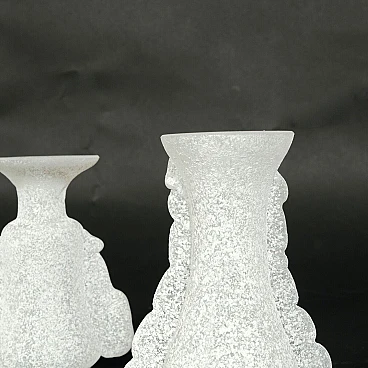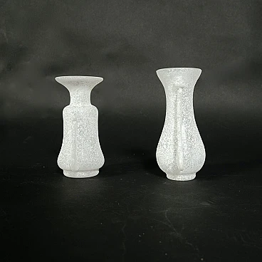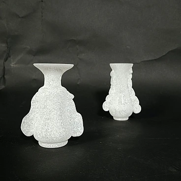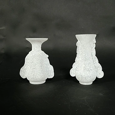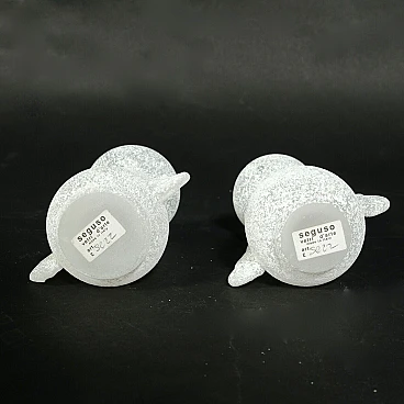 Pair of small Murano glass vases by Vittorio Rigattieri for Seguso, original production from the 1970s. They were made with the idea of recreating Etruscan finds during archaeological excavations: they are in fact made of "scavo" glass, an ornamental glass with a rough surface and a matt finish enriched with white powder; this really wants to reproduce an ancient material. Present Seguso brand on the bottom. The two vases are similar, not the same. The one on the left in the photos has wing-shaped "handles"; it is 13.5 cm high, 11 cm wide and 7 cm deep. In the second vase the handles have a more wavy shape, with round humps; it is 14 cm high, 10 cm wide and 7 cm deep. Excellent condition, intact, without any cracks or breaks (see photos).