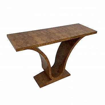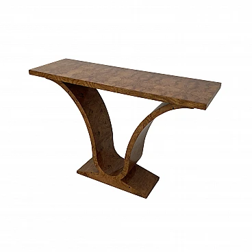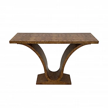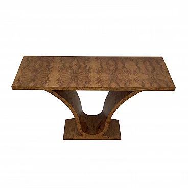 Double-sided console in art deco style with wooden structure and walnut root veneer. Dimensions: width 120 cm, depth 40 cm, height 81 cm.