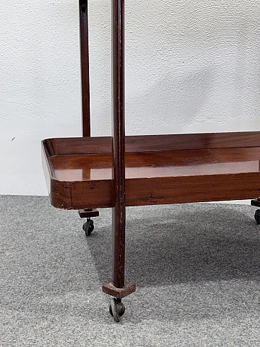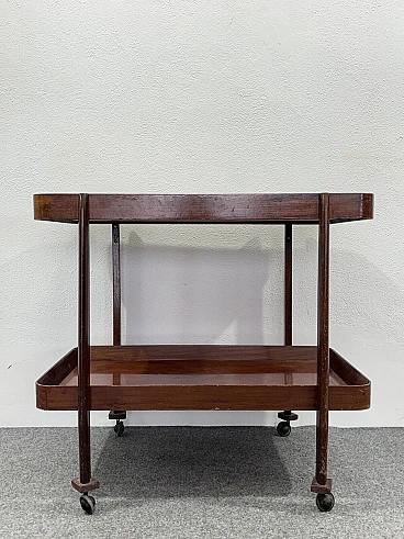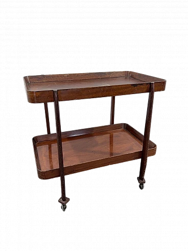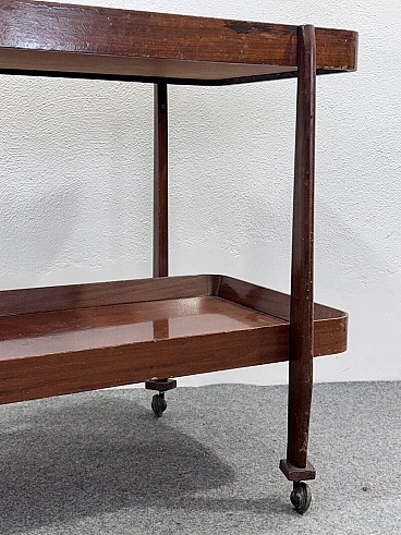 Rustic wooden food cart with double shelf, 1950s. Structure in good conservative condition, there are signs of time due to use and age (see photo); its authenticity is characterized through signs of wear.