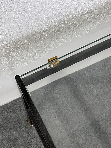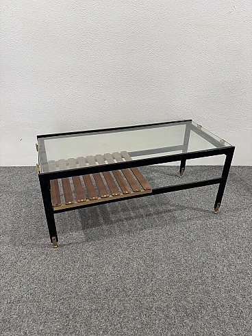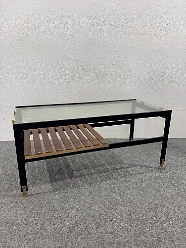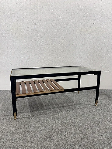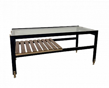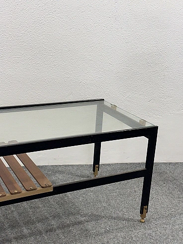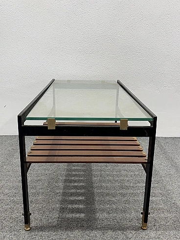 Coffee table by Sant'Ambrogio & De Berti, 1960s. Metal structure, wooden lower shelf, glass top and brass details. Good conservative condition, there are no major aesthetic or structural defects to report, only slight and obvious signs of time due to use and age (see photos). There is a chip on the top.