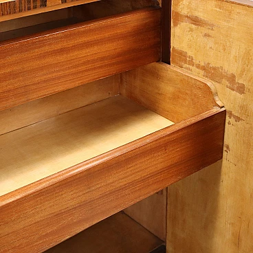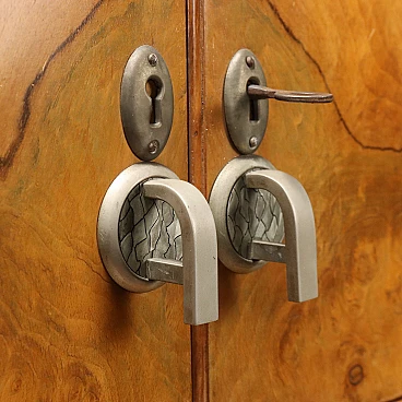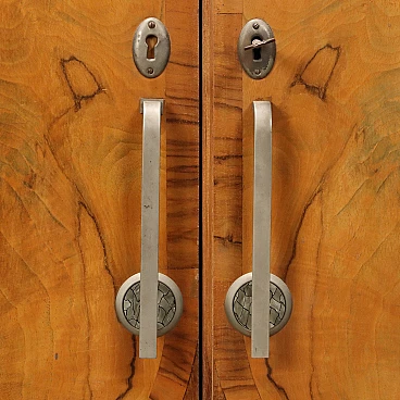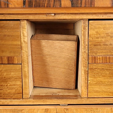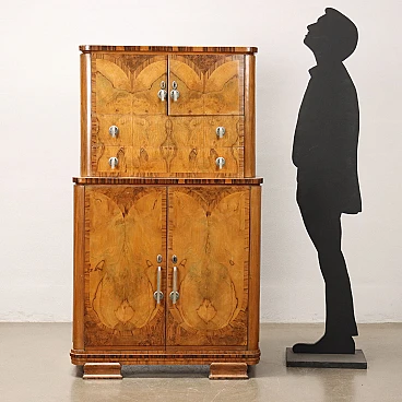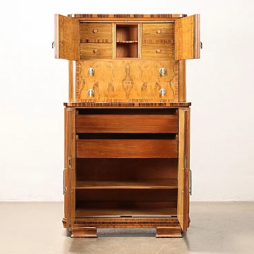 Art Deco sideboard with two doors with internal chest of drawers. The top has two drawers and a pair of concealing cabinet doors with document compartments and small drawers; walnut and burl veneer.