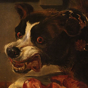 Oil on canvas depicting a copy of the famous still life by Frans Snyders (1579-1657), a dog defending the carcass from two other dogs. Originally from Antwerp, he dedicated himself to painting flowers, plants and fruit but later preferred to paint with animals and hunting scenes and became one of the first animal painters of the Flemish school. A painting of great pictorial quality, the realism with which the animals and other naturalistic details have been reproduced is notable. Painting that develops horizontally, of beautiful size and strong visual impact, adorned with a carved and gilded (bronze colored) wooden and plaster frame. Ancient frame, not contemporary, which has small lacks of decoration and various signs of aging (see photo). Painting that has undergone conservative restoration, relining, replacement of the frame and recovery of color in some small spots. On the back there is a reference to the Flemish painter Pieter Boel