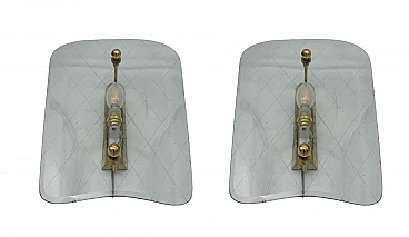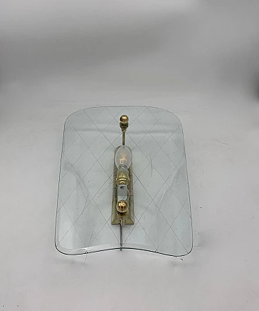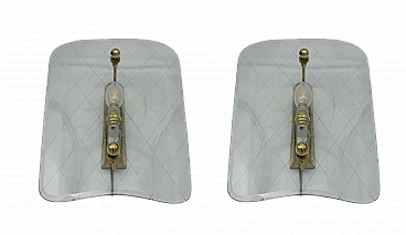 Pair of glass and brass wall lights by Fontana Arte, circa 1950s. Good conditions. Very beautiful and light glass elements, probably the classics of Fontana Arte. It is all original, the brass structure only has some signs of wear. Fantastic uncracked glass. New and working electrical system. Note the beauty of the mold-blown glass with internal grinding. Excellent elements that can furnish different rooms, from the kitchen to the living room, from the entrance to the bathroom. Each has an E14 lamp holder; LED bulbs are also recommended.