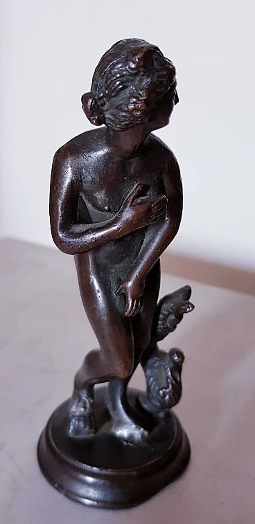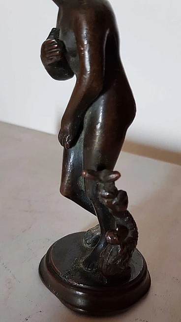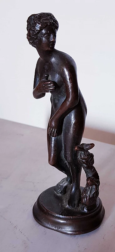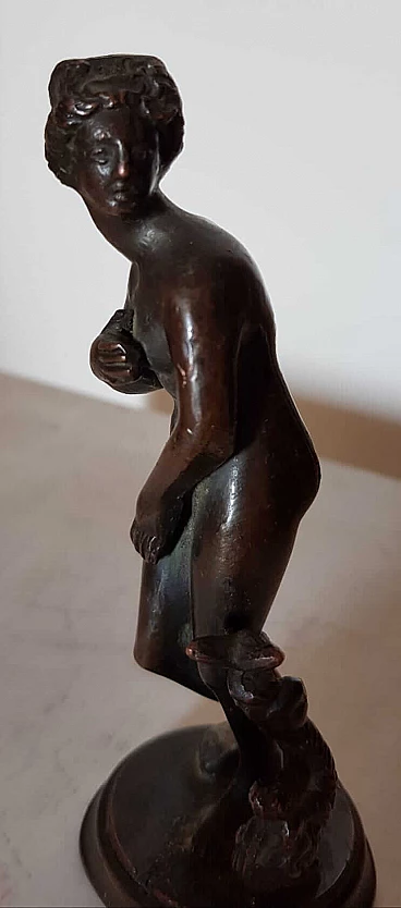 Bronze Sculpture With a female figure close to a newt ridden by a baby/baby. 19th (18th?) century. Small sculpture from the ancient model probably of the goddess Venus. Beautiful patina of time. Conservation status: very good; dent on the edge of the base, without effects on the overall pleasantness of the sculpture. Minimal signs of wear.