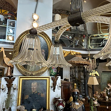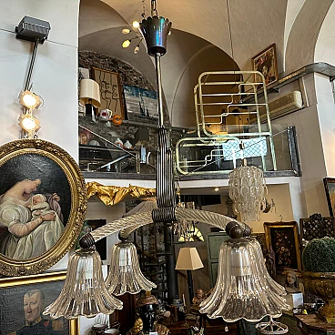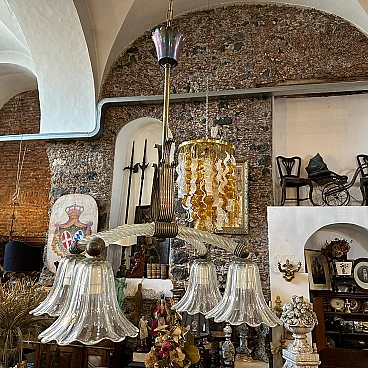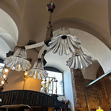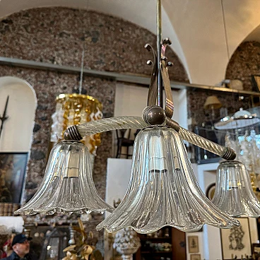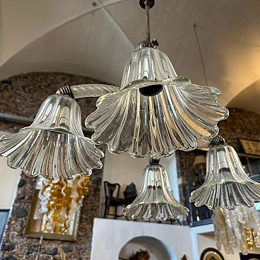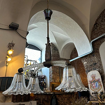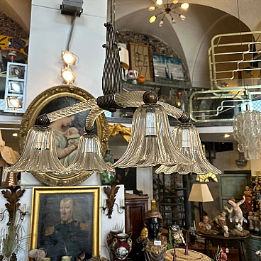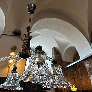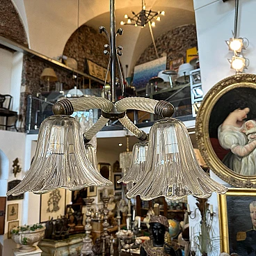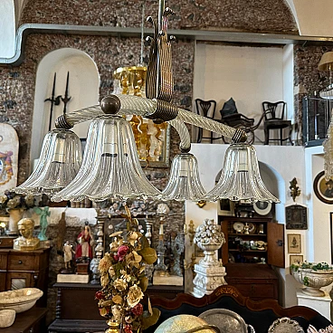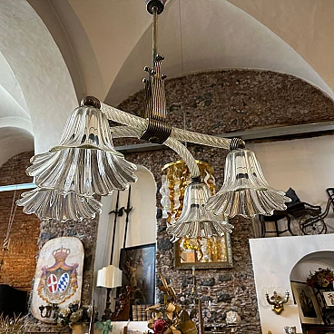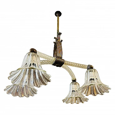 A striking chandelier designed and produced in the 1930s by Barovier, in brass with original patina and transparent Murano glass. In excellent condition. The combination of Murano glass and brass in an Art Deco chandelier is a beautiful combination of elegance and functionality. Art Deco design is characterised by geometric shapes, bright colours and luxurious materials, making it a popular choice for lighting fixtures in the 1930s. This rectangular four-light chandelier provides ample illumination and serves as a focal point in any room. The use of transparent Murano glass allows the light to refract and create beautiful patterns, adding a touch of atmosphere to the room.