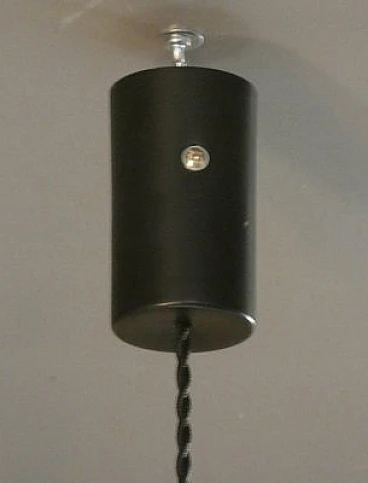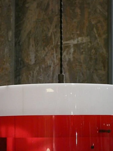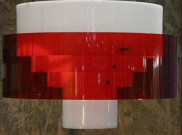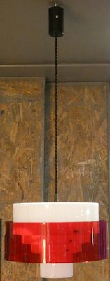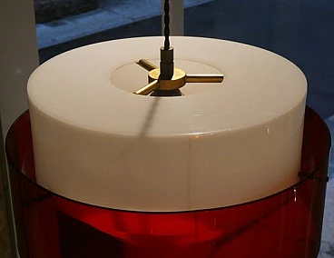 are made of shiny acrylic material and are connected by brass screws. The three bars of the lamp holder rosette are original and made of polished brass. The cable is made of fabric braid and the ceiling stud is made of enamelled metal. It gives the environment where it is placed a beautiful filtered light and also leaves beautiful shadows on the nearby walls. The pendant lamp is in near-excellent vintage condition. The electrical system has been rewired in accordance with the law while the lamp holder (overhauled) is original.