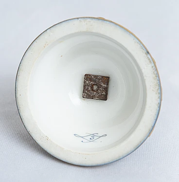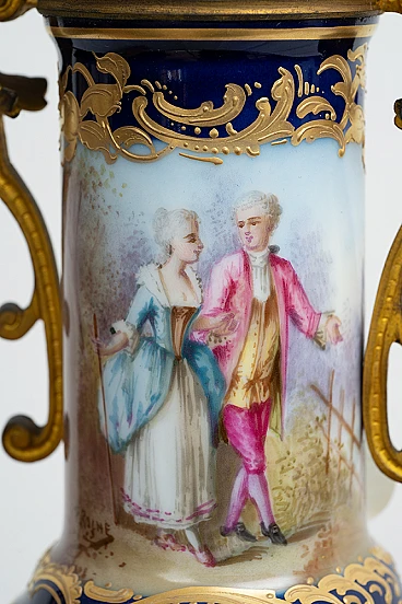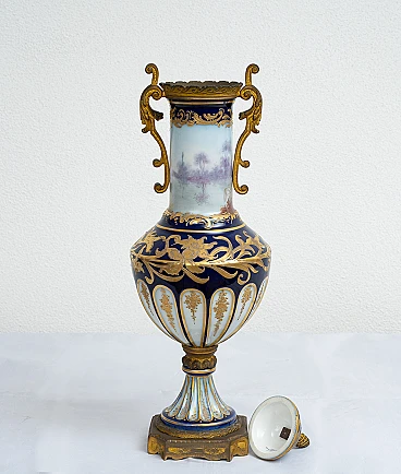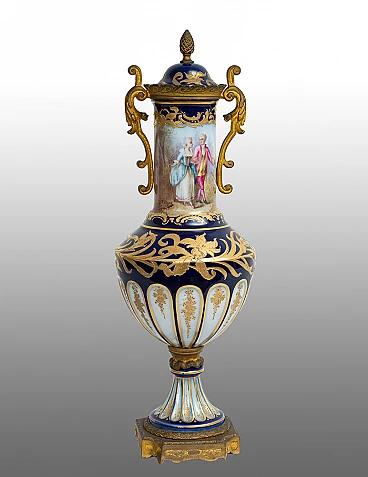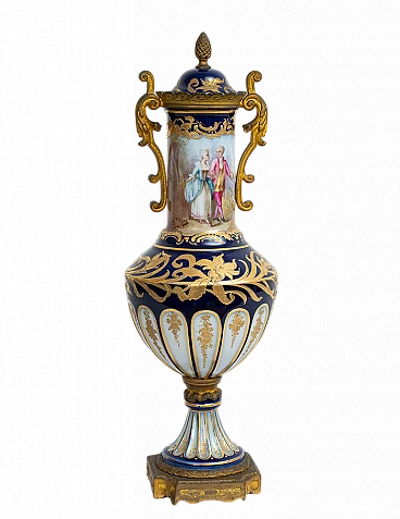 Napoleon III vase made of Sèvres porcelain with gilt bronze inserts, made in France in the 19th century. The central body has pods with gold floral paintings in the center. The overlying part features a gallant scene enclosed between two gilt bronze handles. The lid, also painted with floral motifs in gold, ends with a gilt bronze pinecone and bears the Sèvres mark underneath. Complete with certificate of authenticity. We are at your disposal for further clarification or photographic details. Shipment throughout Italy, Europe and the Rest of the World in maximum security and traceable. Shipping will be arranged privately.