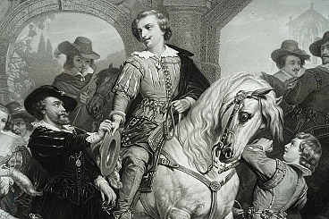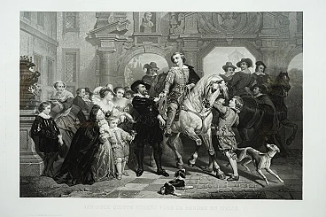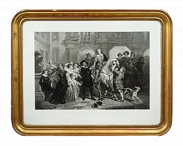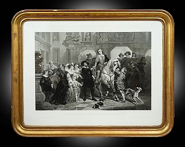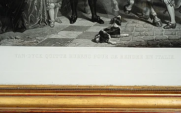 French Napoleon III print depicting Van Dyck saying goodbye to Rubens to come to Italy, 19th century. Coeval frame. The scene is filled with characters, and the two artists are placed in the foreground at the moment of the greeting; in the background is architecture with landscape behind. Work complete with certificate of authenticity. We are at your disposal for further clarification or photographic details. Shipping throughout Italy, Europe and the Rest of the World in maximum security and traceable. Shipping will be arranged privately.