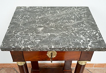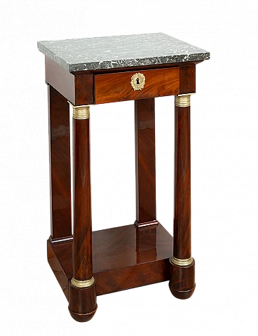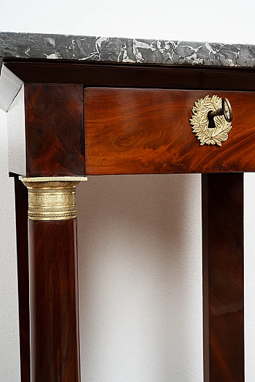 French Empire console table in mahogany feather with a Belgian gray marble top, early 19th century. The front is punctuated by a small drawer highlighted by a finely chiseled gilt bronze keyhole plate. The two sides feature two mahogany feather columns ending with finely chiseled gilt bronze capitals and base. Restored by traditional handmade shellac and alcohol method. Complete with certificate of authenticity. We are at your disposal for further clarification or photographic details. Shipment throughout Italy, Europe and the Rest of the World in maximum security and traceable. Shipping will be arranged privately.
