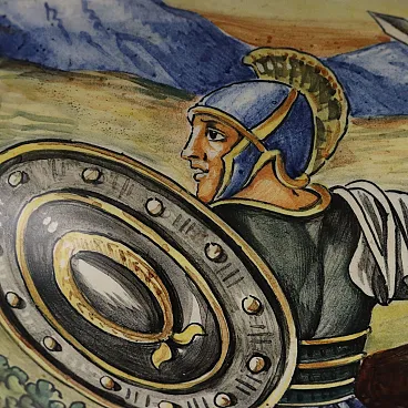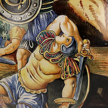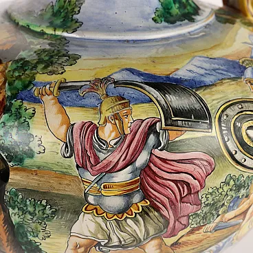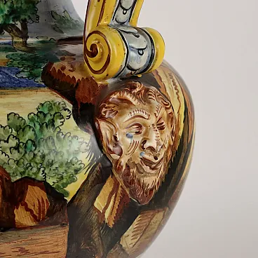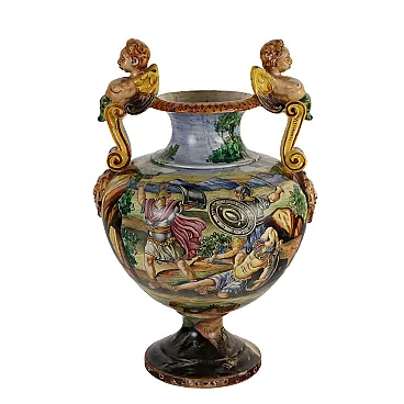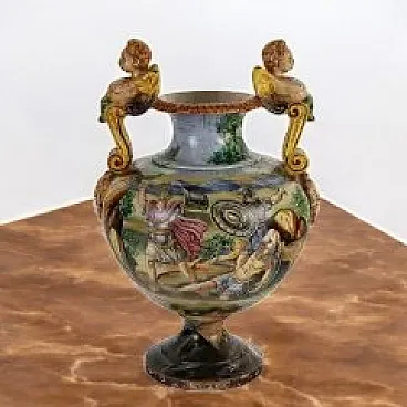 Hand-painted majolica vase with ancient battle scene. Hinges with winged figures and masks.
