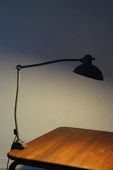 A magnificent example of this rare German classic with its domed shade and integrated Bakelite switch, patented rotating ball joints and iron clamp base. Kaiser Idell is a series designed for Kaiser Leuchten by designer Christian Dell. His eponymous lamp series became popular after the 1936 catalogue and became synonymous with German industrial design. Model 6726 has an impressive wave-shaped arm. It can be moved in three places and is adjustable from approximately 58 cm to 100 cm in height. The lamp has a unique patina due to its age, reminiscent of the original factory finish, and the characteristic dome at the top of the shade bears the Kaiser Idell logo. Thanks to its precise positioning and exceptionally long reach, this particular model '6726' has always been appreciated by architects and designers. Kaiser Idell is widely recognised as a symbol of noble Bauhaus design, exquisite choice of materials and engineering precision. The size of 131 cm is a flat measurement with the lamp fully extended.
